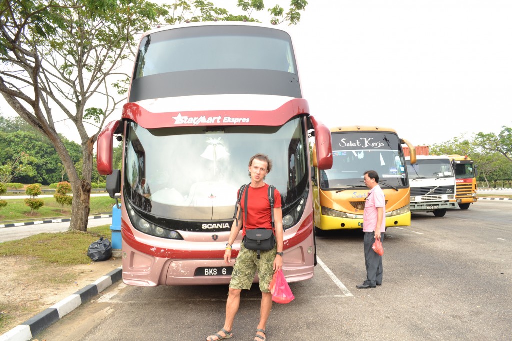 Выспавшись утром, собрав свои чемоданы, мы отправились на автобусную станцию, что бы продолжить свое путешествие. И так мы следуем в Малайзию. На метро и городском автобусе добрались до станции, где купили билеты по 30 дол/чел (Сингапур – Малайзия), отправлялись мы с «Golden mile complex», загрузили чемоданы и уселись в комфортабельный автобус. Какие там самолеты! Автобус намного удобней – кресла разлаживаются в лежачее положение, как в кинотеатрах Аймах, кондиционируемое помещение, и у нас были самые лучшие места ( на втором этаже в первом ряду перед лобовым стеклом). Закрылась дверь автобуса и мы отъехали от станции. Пять минут по городу и вот мы подъезжаем к границе Сингапура.